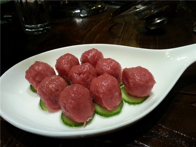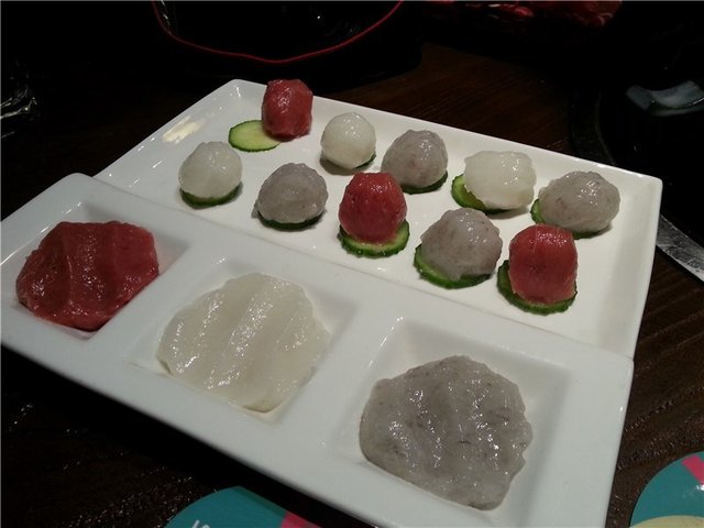 鱼,虾,牛肉的组合,颜色搭配的挺漂亮的,摆放的也很精致。各种丸滑各有各的特色,味道都是一样的鲜美有弹性,卖相上很加分。