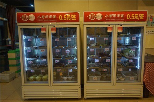 串店必不可少的就是冷柜了,明码实价,每签5毛钱。两个大冷柜,荤素都是分开的,打开柜门里面没有异味,东西看着很新鲜,生的也是很诱人的。