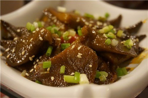 这个叫凤毛麟角,就是公鸡的鸡冠,一个个的都很完整,因为这道菜我注定不能成为食物链顶端的人,看着有点怕怕的,朋友很喜欢吃,说很劲道,QQ的都是筋,很好吃。