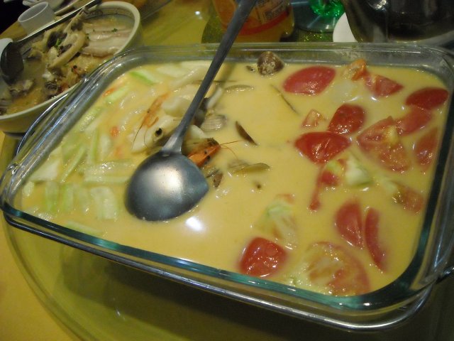 海鲜面疙瘩:颜色搭配的很好看,白色汤底 点缀青色丝瓜和红色番茄 让人看了很有食欲 汤白白的 看上去很有营养呢 尝了一小碗 很鲜 浓缩了海鲜的鲜味和素菜的清香 汤里加了一点淡奶 很中西合璧的一道菜 也值得推荐