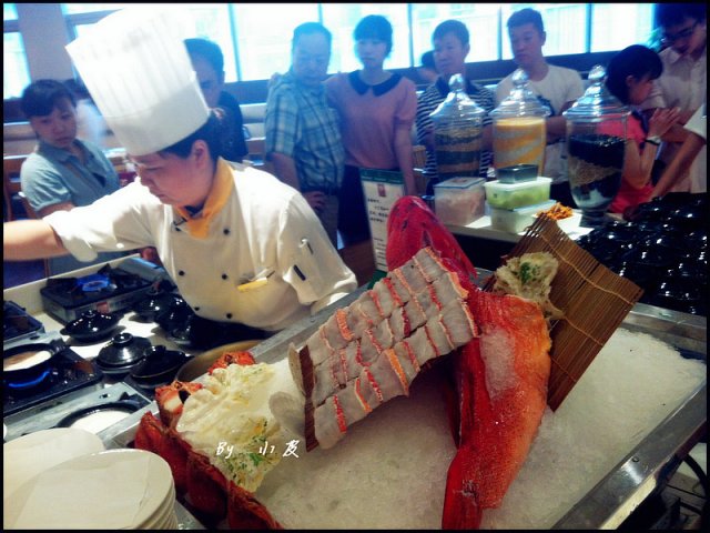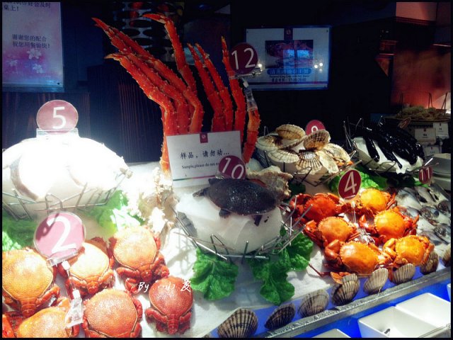 到了里面真的很大,我们居然是在最里面,我看到刺身离我们真的好远哦~海鲜离我们也好远哦