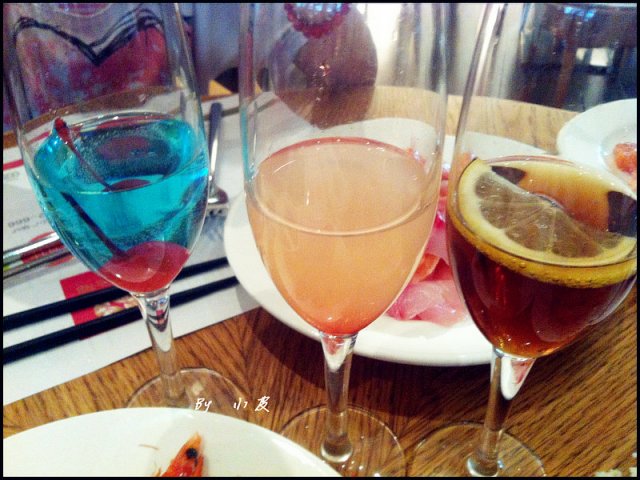 三杯鸡尾酒本来想装样,干一杯的,可吃货的天性,喝一口。干什么杯,直接吃啦!还有很多好吃的,没空干杯,这时候就不喜欢这种到处跑的,跟朋友出去吃饭都没办法聊天诶。