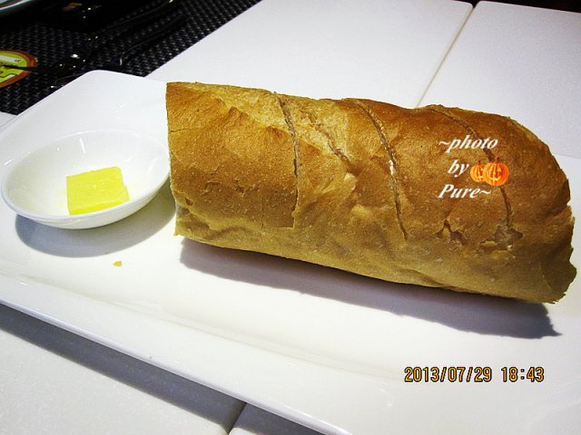 【餐前面包】是烤的很香脆的法式长棍。配有黄油在小餐盘里。面包有切开的痕迹,可惜没有切到底。下面由于面包的韧劲切开比较困难。其实可以学习皇品那样切成小块更方便些。面包外层香脆。里面很白,一看就是精细的面粉特制而成。用小刀抹些黄油在侧面,愈加香浓可口。面包挺敦实的。大家都很期待后面的主食。就撤了。好浪费555