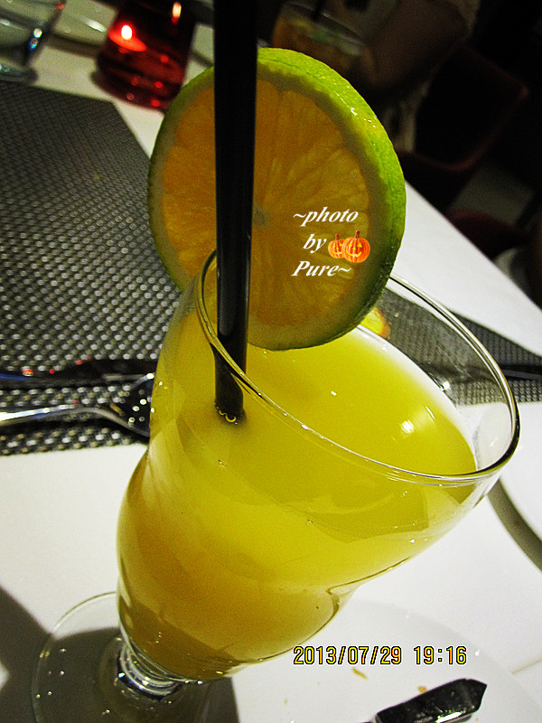 【橙汁柠檬气泡水】是浓郁的橙汁味道。一开始有小气泡,不过后来气泡就因为放置太久而消失了。上面插有柠檬。造型上是非常美貌。西餐厅的basic要求。美貌加情调。