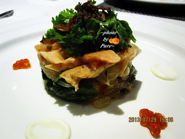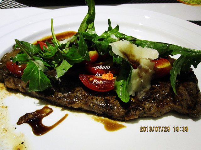 【泰式鲑鱼水果色拉】这道菜绝对惊艳啊。上来一看就非常有层次感。依次是由香茅叶,鲑鱼,柚子,龙眼堆砌而成。香茅叶的口感让人联想到冬阴功汤,好喜欢的泰式风味。鲑鱼自然是重点,略带烟熏口感,恰到好处。柚子和龙眼又显得非常爽口。这样奇妙的食材和口感非常喜欢。吃个干干净净,一点也不舍得浪费。而且旁边还有咸咸的鱼籽颗粒。好大好饱满。这道前菜给我的印象最深刻,甚至超过了后面的主食牛排。