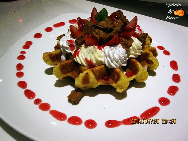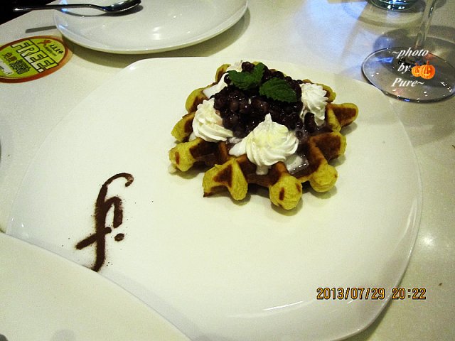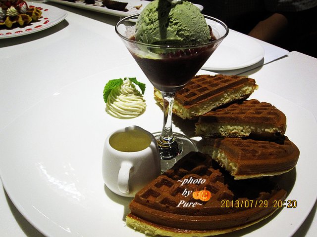 【抹茶红豆松饼】就是普通的松饼,配上抹茶红豆冰激凌和一坨奶油。松饼软软的,比起西九巷来说,是好吃那么一点点。抹茶我喜欢的啊。要赶快吃。冰激凌容易化。相比之下,更偏爱草莓卡仕达脆饼。