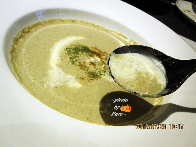 【奶油蘑菇浓汤】奶油味道倒是没有觉得。蘑菇味道超级厉害。闭着眼睛也能感觉到里面有很多很多很多的蘑菇精华。上来的色泽是灰棕色里面带有奶白色调料的勾芡。撒有粉末状物质。如果奶油味道更浓厚些,喜欢的人会更多吧