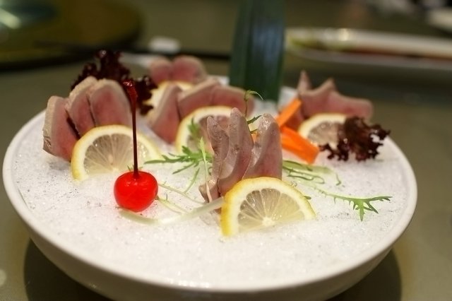 清酒鹅肝:摆盘很有档次的感觉~一般的小店也就随便切切~摆成一排而已吧。有冰铺起来的感觉就是好