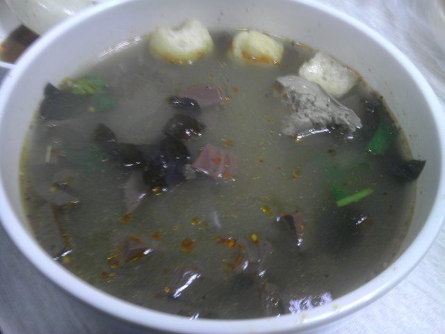 鸭血汤尝了一口,反倒觉得挺好吃的,麻油味很香,鸭血也挺嫩的,就是鸭肝好大一块没咋切显得有点糙。