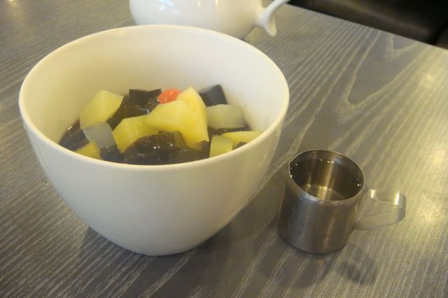 鲜杂果拌龟苓膏,每顿饭后都想吃个甜品,他家冰激凌、西米露都没有了,只能点这个,但是也太苦了吧,把糖水全部倒进去,还是很苦,╮(╯▽╰)╭