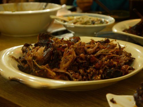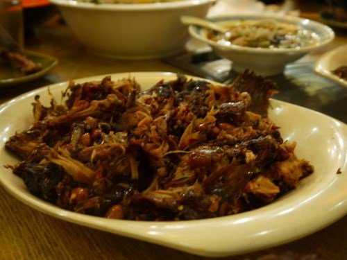 这个绝对是一道硬菜!2斤多的整只兔子,烤的焦香四溢,非常的引人食欲。烤兔也是分为麻辣和不辣的两种,一样点了一只,很土豪的感觉。其实很想整只兔子的抓过来啃,后来考虑到作为女人不能太粗鲁,还是乖乖的等着店员帮忙处理吧!