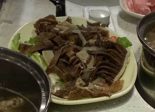 和同事两个人点了一个牛羊肉套餐、一盘百叶、一盘毛肚、一盘鸭肠、一盘贡丸、两个扎啤这些饭量大点的也够吃了,最后吃的实在吃不动了没有吃完就撤了。