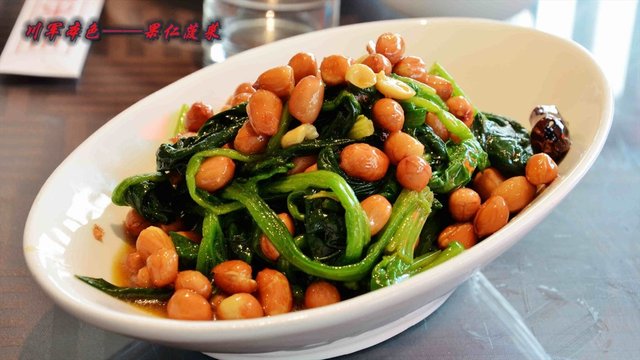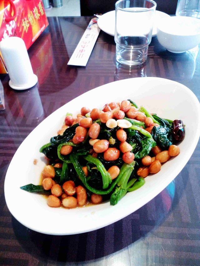 想来前面两个都是肉菜,怎么也得来个凉的素菜吧,所以捏,果仁菠菜是我极爱的,尤其是里面的花生豆,脆脆的是极好的。