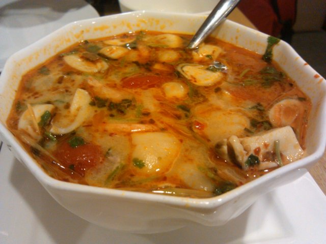 汤的颜色很浓重,配料丰富,有虾,蟹,口蘑,圆葱,番茄等。汤的味道很鲜美,酸酸的微辣,味道很浓郁。里面虾很鲜,肉质很紧致,吃着劲道弹牙;口蘑QQ的,味道很清新,吸收了汤汁的味道让口蘑吃起来滋味十足,非常的好吃。