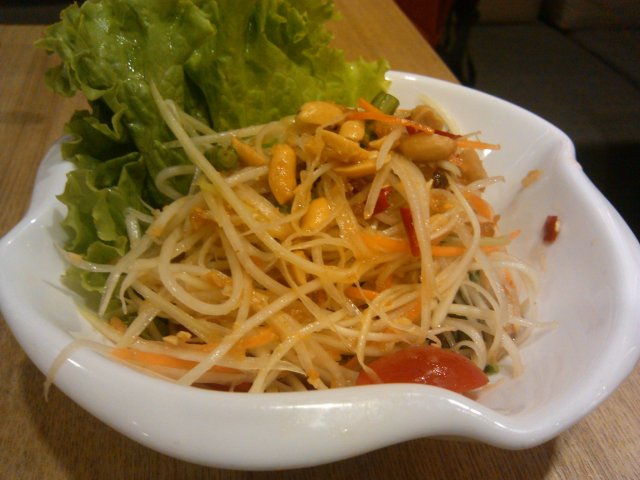 沙拉是以青木瓜丝为主,青木瓜丝粗细均匀,口感清脆,味道很是清新,吃着酸辣爽口,很开胃。还配了小番茄和花生碎等配料,花生碎很提香,吃着酥脆可口,味道非常好。