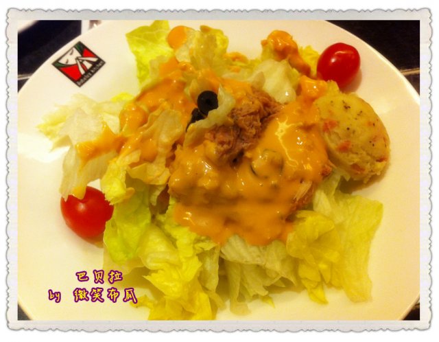 金枪鱼沙拉---金枪鱼的量还可以,蔬菜不少配上千岛酱酸甜可口!