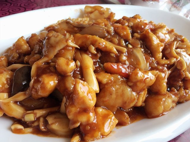 八珍豆腐,30米。强烈推荐,炒鸡好吃啊,打包之后吃着折箩都觉得特别幸福的那种,不过油大是不能避免了,偶尔放纵一次自己的胃吧。一大盘子端上来都惊了,吃完之后还打包了满满一盒。豆腐炸得外壳酥脆,调味之后咸鲜口儿,虾仁、平菇、鸡肉丁、蟹腿菇、海参、鱿鱼、贝类都很新鲜,最爱的是裹上面糊的鱼片,没有鱼刺,吃起来特别鲜美。海鲜类的食材没有水发过的味道,这点很难得。