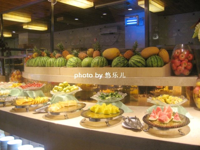 里面是自助区,各种新鲜水果,一排大冰箱全是一盘盘的肉。鸡肉猪肉五花肉牛肉培根午餐肉鸡肉等等,连牛肉都有好几个品种。新鲜水果切得很好,看着都很新鲜,西瓜也分红瓤和黄瓤,还有小芒果、火龙果、香蕉、橙子、番茄、哈密瓜,真的是大部分水果都有了。真是给力啊!!!