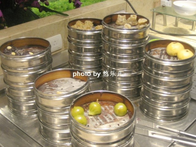 叠得很高的蒸笼里放着各式蒸点,什么烧卖、紫米糕、豆沙包之类的。看着也不太有食欲,易饱食品,不吃。