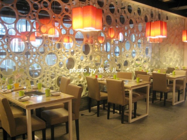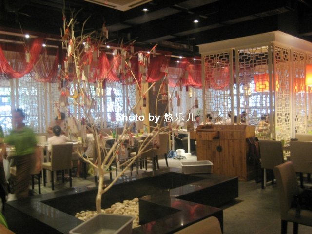 昏黄的灯光,简约的木质桌子沙发椅,各种镂空雕花设计。红色的灯笼灯,很可爱。