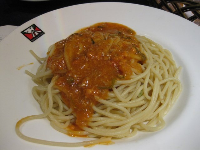 海鲜意面,太清淡了,和香辣茄汁培根意面形成了鲜明的对比。里面的所谓海鲜也不大新鲜,墨鱼圈什么的有点老,好像咬不太烂,不知道是不是本该这样子。