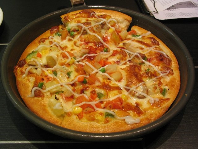 田园乡村PIZZA,素的,里面是玉米粒、青豆、茄子丁、青椒丁、胡萝卜丁等,没有夏威夷好吃,可能因为价格便宜,放的芝士也少了不少。
