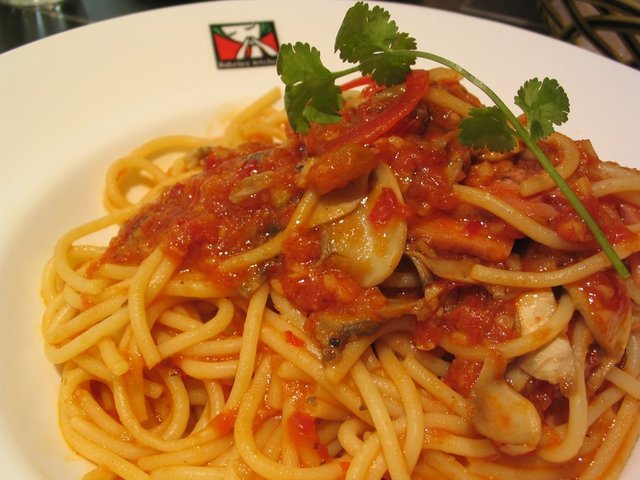 香辣茄汁培根意面,纯粹是被它的价格所吸引。看见实物的第一感觉是盘子大量少。吃过后,量还是可以的,对于饭量不是太大的人,单一份这个绝对能吃饱。酱里包括了培根、蘑菇等,口味有点重,不知道是不是只是偶这一份调味汁加的有点多,偏咸也偏辣,对于不太能吃辣的TX,慎点,但偶还是比较喜欢偏重的口味,推荐。