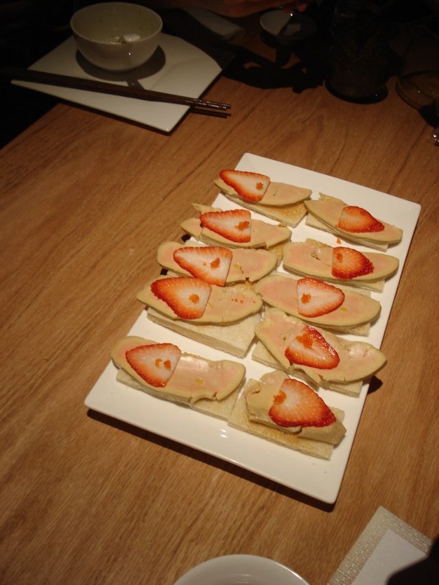 和风法式鹅肝配面包片,造型蛮不错的,用草莓做装饰点缀,鹅肝的口感很细腻,不会觉得很肥。