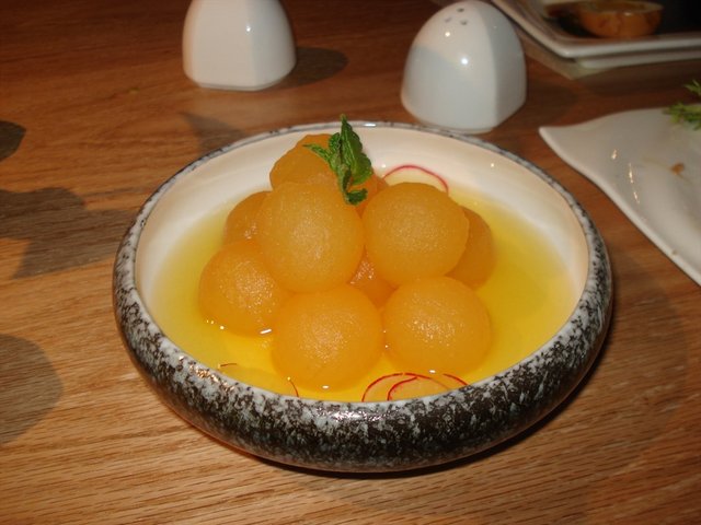 金桂红花浸瓜球,用果汁煮冬瓜球,微甜,带着果香味。