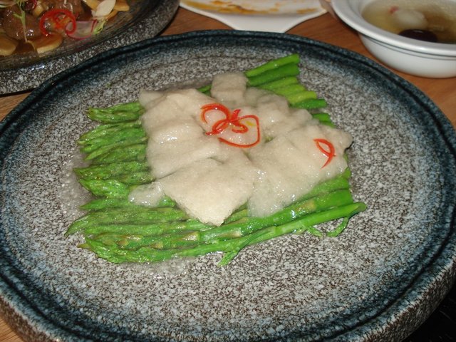 茶汁竹荪芦笋,清淡的蔬菜,竹荪事先用绿茶浸泡过,软软滑滑,芦笋鲜嫩,绿白亮色的搭配,光视觉上就让人觉得清爽啊。