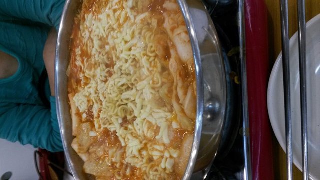 他家的生意真的非常的好,去了是肯定要等位子的,地方不大,小桌子排的也比较的拥挤,不过老板比较热情,选的芝士锅和烤肉锅,2个锅,但上来其实是放到了一起,半成品上来,放在电磁炉上,咕咕的烧开,就可以吃了,芝士其实比较的腻人,吃到最后非常的容易粘锅,烤肉上来就是一团肉,看着不清爽,烧出来还是一团,配合芝士就觉得乱七八糟的一锅,没有蔬菜的搭配,吃起来觉得非常的不合理啊,特别点了他家的夹心年糕,咋一吃,很好吃,吃几个后就很是腻人,总的说了2个人吃1锅那是足够了,老板配合每桌都有一壶大麦茶,比较解腻,但是我吃完的感觉还是很腻,不适合我的口味,下次不会去了