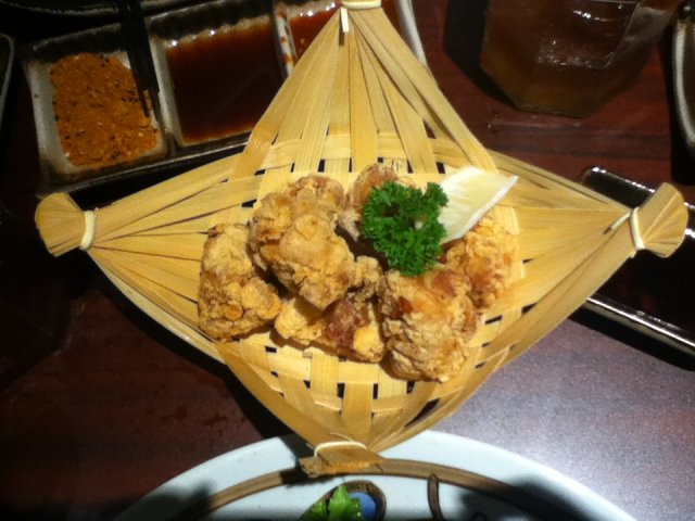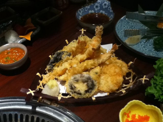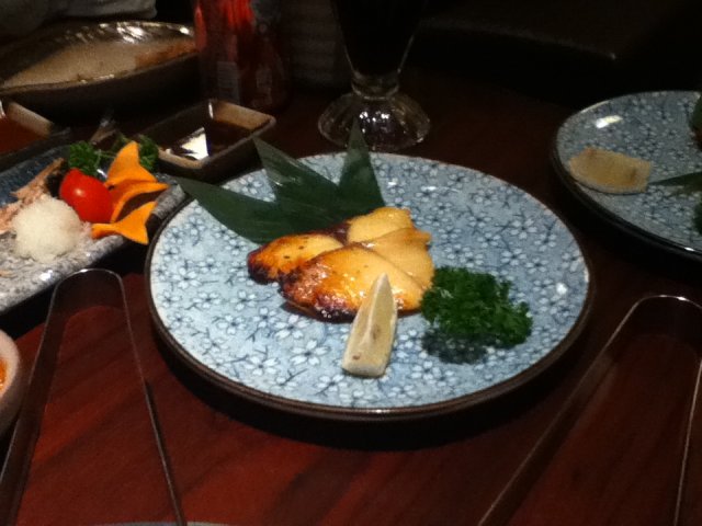 下一道,烤鳕鱼,烤的是还行,边边上有点点焦,当中部分烤的很好,可是。。。可是。。。为什么那么甜啊~~~~我情愿它没有甜味~~。炸天妇罗,这个只能说无功无过了~~~。炸物鸡块,有姜的味道,不稀饭,鸡肉的味道感觉腌的不是很好,鸡肉也很老,还没路边那种什么超级鸡车那种的好吃,不推荐