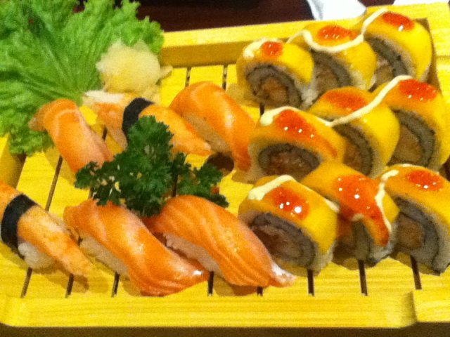 然后就上了一大盘寿司拼盘,其实看上去感觉就三种啦,牛油果,三文鱼,蟹肉,尝了牛油果的还不错,一口一个咬下去很有满足感,三文鱼的就无功无过啦,反正只要新鲜就是那个味道了。