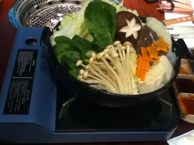 就在我感觉差不多要吃饱的时候,上了寿喜锅~~~这个真的是煮了好久啊,不过自己从倒酱料开始煮,然后自己加肉,慢慢煮熟,看着还是蛮好玩的,里面料很足,就是感觉偏甜,吃一点还好,吃多了会腻。