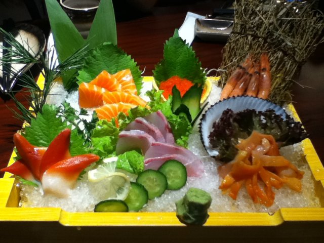 然后入正题,当当当,刺身,三文鱼,北极贝,甜虾,海胆,鱼子,视鱼(这个不确定),他们家的刺身非常滴新鲜,摆盘也很漂亮,基本每个尝了一片,就北极贝没尝到~~下筷子太慢,反应过来已经么了~~