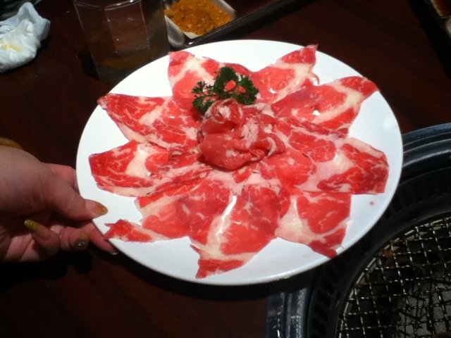 吃完刺身上烤肉啦~~他们家烤肉也很新鲜,那种最大块的应该是梅花肉吧,最稀饭那种,他们家的烤盘是那种不太容易粘底的那种,非常容易烤。