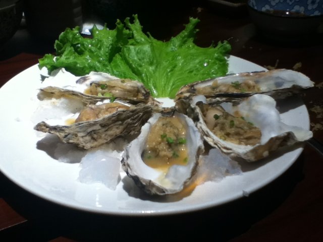 就在我们都吃的差不多了,开始瞎掰的时候,上了一道吸引我们注意力的菜~~烤生蚝,端上来的时候下面火还在加热滴,其实平时如果有的选,我都会吃扇贝而不是生蚝,因为一直觉得生蚝有股味道,不过这家生蚝处理的蛮好的,推荐尝尝看。