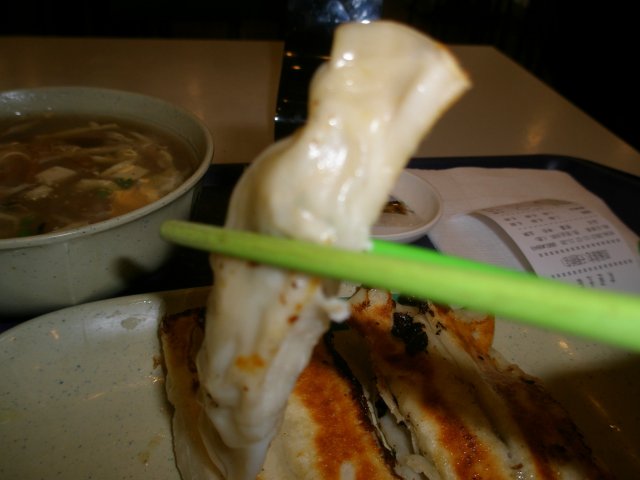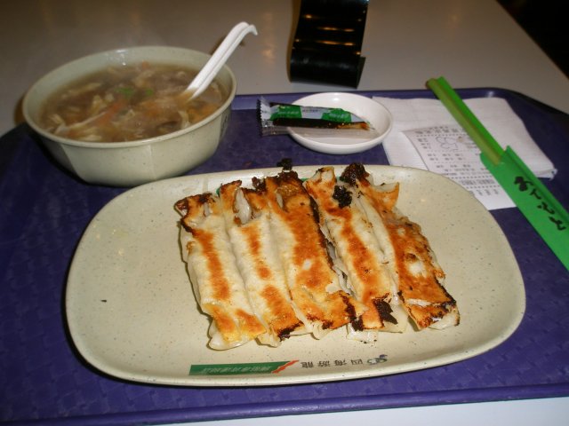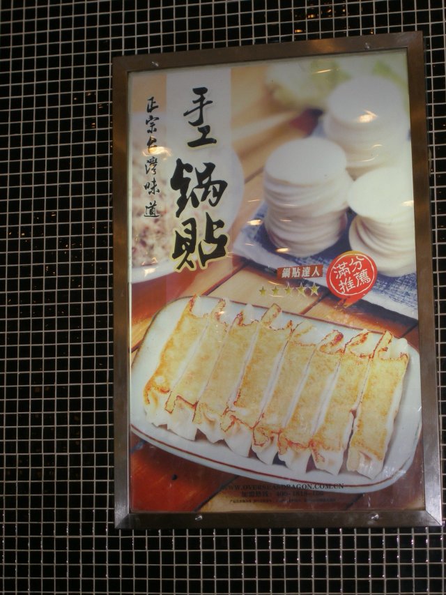 锅贴的样子满特别的,和我们传统的饺子形不一样,他是长方形的,里面没有汤汁,是素菜和肉的馅儿,有点松散,皮子也不是脆脆的,个人认为没有我们传统的锅贴好吃,这种好像是台湾流行的。说实话味道其实相当一般般,但是配上他家特制的甜酱或者辣酱味道就好很多了,淡淡的甜或辣配上锅贴一点也不油腻,所以还是蛮赞的,一份五个,还有辣的口味可以选择。
