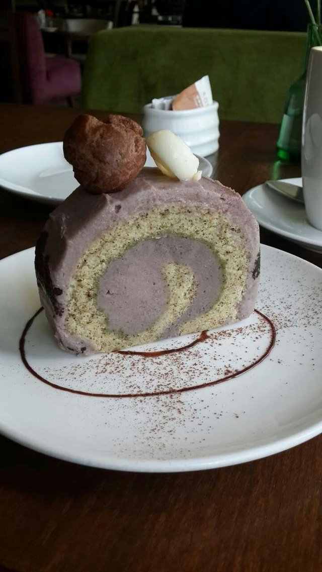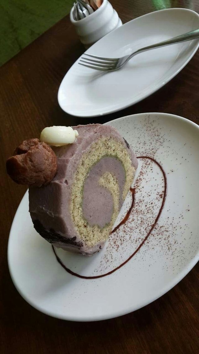 餐后甜品:不知道具体是什么的蛋糕卷,但是样子很漂亮。内圈和外圈卷的是紫薯,里面可能是红茶戚风,挺清爽,不甜不腻。一直吃巧克力的,芝士的,偶尔换一换小清新的蛋糕卷,倒是觉得很不错。