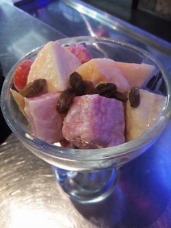 开始时我光顾着和闺蜜聊天,也没摸清那个烤炉的窍门,不小心把个面包片给烤糊了,服务员发现马上过来给拿上面去了,并指导我们如何将齿轮对准链条,可能是被大堂经理发现了吧,过来跟这个服务员说了几句,没多久端来两杯水果沙拉,说是赔偿我们烤坏的面包片的!我和闺蜜两人面面相觑,她小声跟我嘀咕,这个水果沙拉多少钱一杯?我说我只知道面包片1.70一片。一会加串的时候她特意看了下水果沙拉的价钱,一副赚到了的模样告诉我18一份!话说,还多亏了这水果沙拉了,它比啤酒可凉快多了!全靠它给我两降温了!里面内容很丰富:西瓜、苹果、哈密瓜,还撒了很多甜甜地葡萄干!
