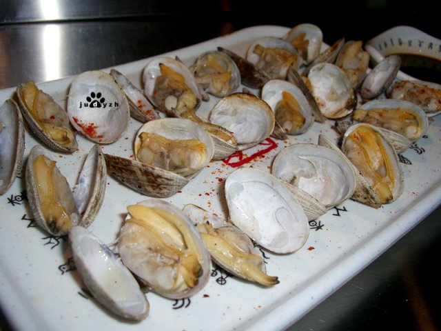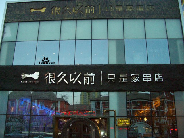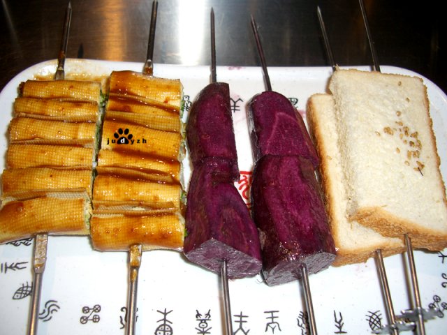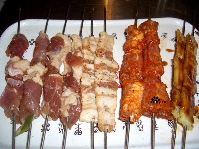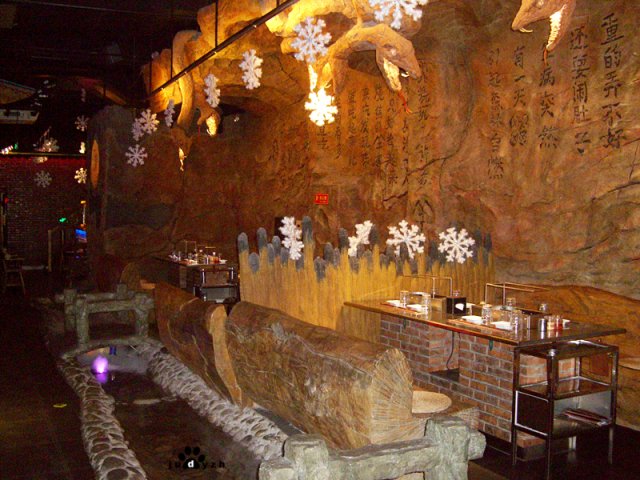 很早就挺说过这家店,前段时间看到有团购就赶紧团了张,正好家附近刚开业一家分店,每次路过都馋的不行。前些日子本想中午去,谁知道人家不营业,营业时间是从晚上5点到凌晨3点。。。一直拖拖拖,拖到团购快到期了,外面刮再大风也得去了,再仔细一看团购页面,晕,我家附近这家店,团购券仅限晚上9点以后使用,试探着打电话问我卡着5点去行么,对方很痛快的就答应了,正好中午没吃饱,早早的就过去了。到的时候服务员正在二楼开例会,店内还没什么人,趁机拍了好多照片,他家装修的挺有个性的,好像一个大岩洞,墙上刻着甲骨文,木质的桌椅,小桥流水,还有吞云吐雾的大龙头。一层有面空着的墙壁,用来放MV,直接投影在红色的砖墙上,看着很有怀旧的感觉。服务员都是二十多岁的姑娘小伙,穿着蓝色的运动服,像是学生似的,热情周到的让人心里暖暖的,时不时过来帮忙弄弄炭火,又时不时的提醒我什么东西烤好了可以吃了,说到烤,今天真觉得自己OUT了。。。。。。一个人吃双人餐,我就知道吃不了,可当一盘盘的端上来以后,才觉得,东西实在太多了,而且,居然。。。居然是生的!我本以为是烤好的呢,有点儿小失望,一个是担心自己烤的不好吃,二是犯懒。后来才发现我的担心是多余的,他家的东西都是腌制好的,放在架子上等着就行了,让我觉得OUT的就是这个炉子!炉子两侧都带有齿轮,把串放进槽里,人家自己就转上了,不用咱手动翻来翻去的那么麻烦,实在是太先进了,哈哈,突然有种刘姥姥进城的感觉。