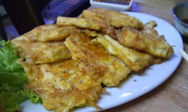 煎豆腐 闻着多香啊 刚好的时候真是充满俺喜欢的那种煎的脆脆的鸡蛋的那种香啊 少蘸点儿汁真是好吃啊 那豆腐 还没有特别特别大的卤水味儿 我最讨厌卤水豆腐了 里面豆腐嫩嫩的 虽然这是句废话 凉了之后 皮还是同样的口感 却没有那香味儿了 怪不得我炒饭那么难吃 我总是觉得饭没扒拉开就顺便又炒了很久的蛋……