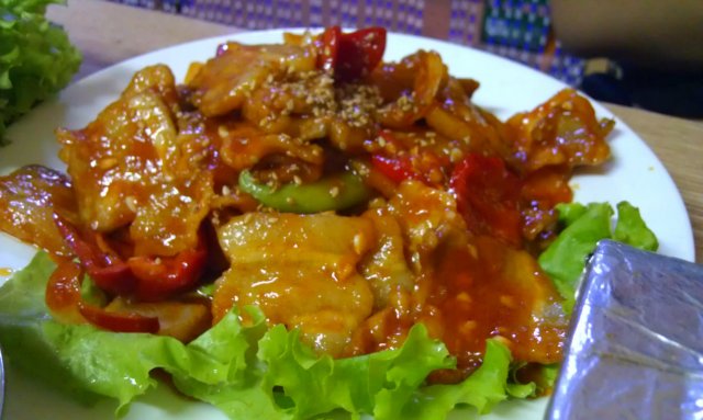 辣炒五花肉 是甜甜版的 几乎不辣 有一层不算薄的红色的油 五花肉偏肥 就很香了 里边的彩椒 好吃啊 我最喜欢吃炒辣椒了 尤其是炒成甜甜的软软的那种了 包生菜吃挺好 店家 还是满慷慨的 看咱仨人 正好给了三片生菜 不像某家火锅要半分生菜就给两片~~