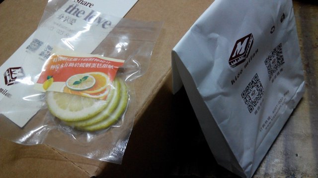 包装:很贴心的用纸盒包好,还送了蛋糕盘,蛋糕叉和蛋糕刀,为了怕腻味还特别送了一份冻干鲜柠檬哦,贴心。