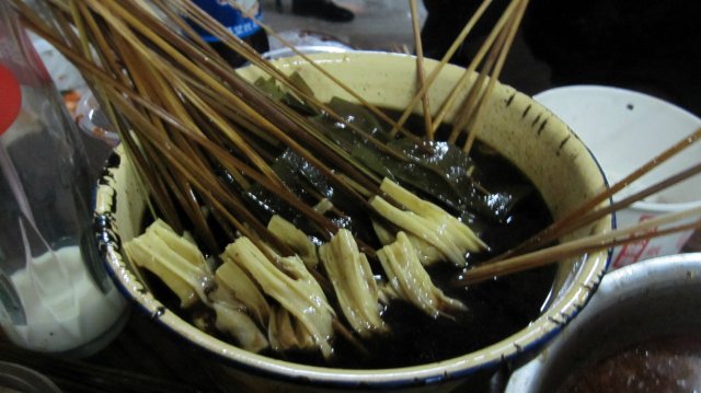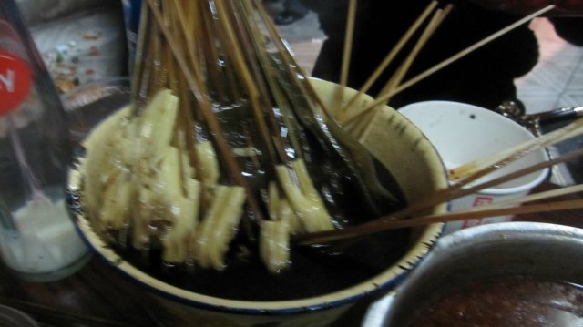 朋友带着去,穿过狭窄的巷道,看到支起一口大油锅,各式串串都放在里面炸。和四川的串串在火锅涮煮是不同的。