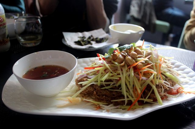 还有道有鱼肉靡炸成酥脆的燕窝一样的,上面盖着青木瓜丝的菜在泰国餐厅是第一次吃到,好像也是新推出的吧。