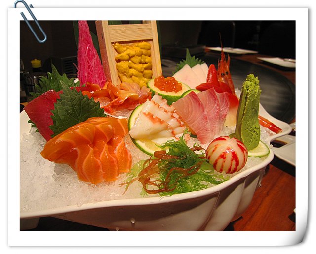 豪华刺身拼盘 华刺身拼盘包括三文鱼、北极贝、金枪鱼、海胆、赤贝、甜虾、红鱼籽、八爪鱼、香油鱼、加吉鱼或鲥鱼。样子很好看,这几种鱼生都特别的新鲜,不过我不怎么喜欢吃鱼生,尤其是那个虾我可不敢吃。