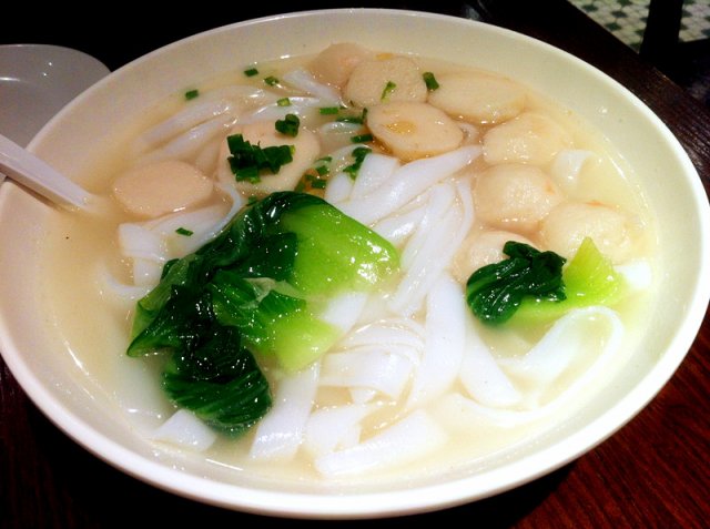 我点了鱼丸河粉,颜色和口味都比较清淡,鱼丸的颜色发粉,肯定不是纯鱼糜的,淀粉有点儿多,河粉不是很韧,所以牙不是很好的人倒是很合适,还有些菜叶调节营养和口味。汤味不错,略淡。
