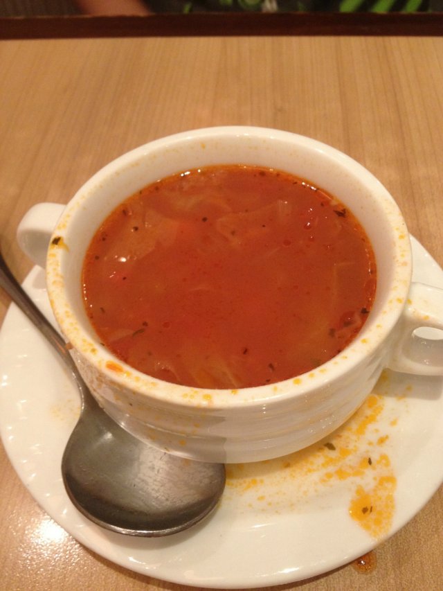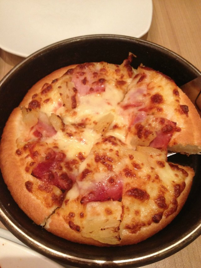 这家店开在南京西路190号靠近黄河路,店面很大很好找,旁边就是大光明影院,周边的交通也很方便。工作日中午去吃的午饭,去的时间蛮晚的1点半左右。店里没什么人,挺安静的,环境不错。选了工作日29元的套餐。主食+色拉+饮料或者汤,价格还算可以。选了夏威夷pizza,x小铁盘装的,刚刚烤出来的PIZZA味道很不错,外皮脆脆的,里面的芝士还能拉丝,非常的不错,趁热吃非常的好吃。汤选的是蔬菜汤,服务员端过来的时候有些洒出来了,弄的盘子里都是,好在汤的味道还不错,酸酸甜甜的很开胃,里面的土豆粒酥酥的很好吃。选了蔬菜色拉,小小的一盘,但是蔬菜种类还是蛮多的,番茄、黄瓜、生菜、玉米都有,最喜欢的是他们家的玉米粒甜甜的,很好吃。总的来说,工作日的午餐性价比蛮高的,下次可以试试其他套餐。