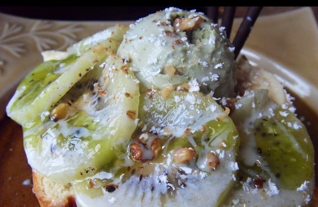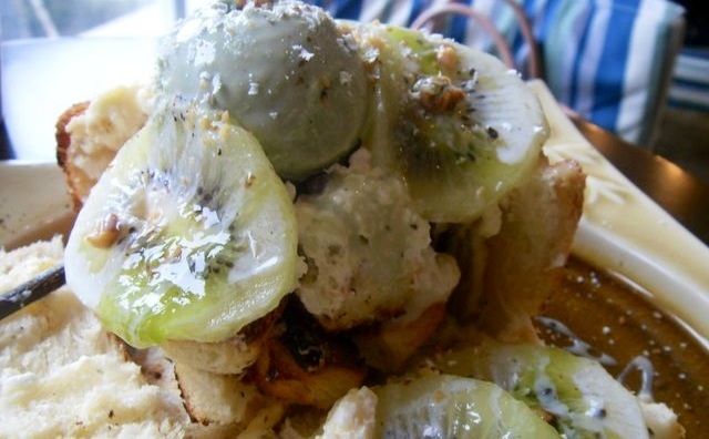 因为是现做的所以小等了一会。端来的时候还是被PL的外观小小震了一下,我想女生都难以抗拒吧。甜品内容:一个三面吐司皮盒子、一个抹茶冰淇淋球、五片奇异果、三根巧克力棒、一些面包块、少许花生碎红豆粒奇异果果酱黄油和炼乳,吐司皮和面包块都是先烤过的,吃到干香干香的,抹茶冰淇淋也还是浓郁顺口,冰淇淋混着花生碎果酱面包块吃,口味多重,就是吃到最后吐司皮没什么味道,酱料少了,另外巧克力换成抹茶味的会更好。其实要自己在家也可以做,在这就是吃个环境吧;